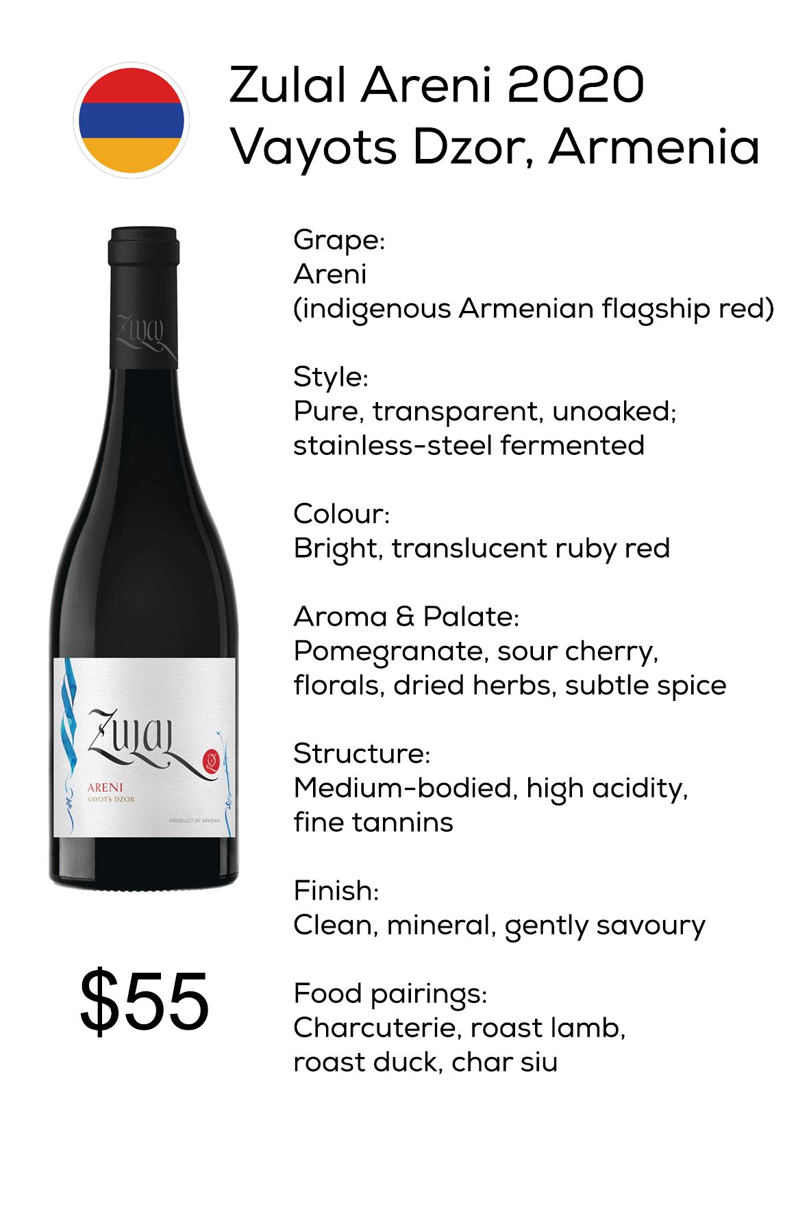 Zulal, meaning pure in Armenian, was founded with a clear mission: to present Armenia’s indigenous grapes with honesty, restraint, and respect for terroir. Crafted by winemaker Arman Manoukian and founded by Aimee Keushguerian, Zulal has become a leading voice in Armenia’s modern wine renaissance. The 2021 Areni comes from Vayots Dzor, widely regarded as the cradle of Armenian viticulture, where altitude, volcanic soils, and ancient vine genetics shape wines of elegance rather than force. This is a red wine that bridges deep history with modern clarity.